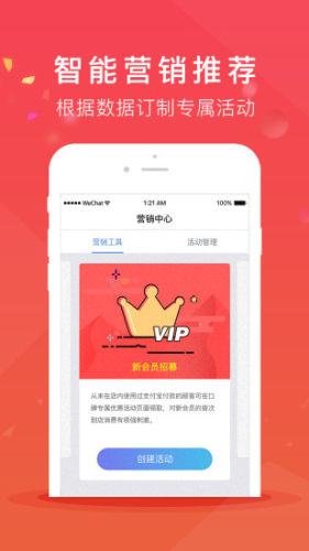 还可发布多种顾客喜爱的营销活动,以及查询活动详情数据,帮助商家留住身边的生意。