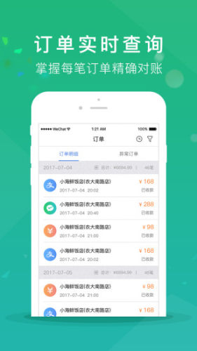 门店订单数据实时查询,以及日汇总,月账单可辅助账目统计