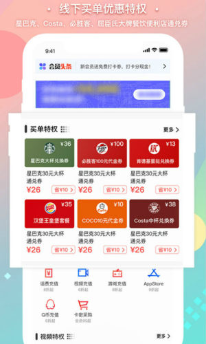 会省app,让您享受会员八大权益,免费领取爱奇艺半年月卡、话费30元减免券,还有星巴克、Costa、必胜客、屈臣氏大牌餐饮便利店通兑券;此外,会省还一个网购平台,在这里能够买到各类优惠的商品哦!