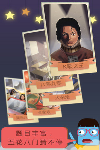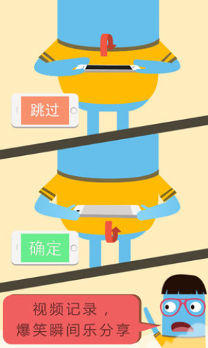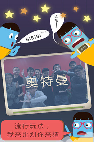 打开游戏立即跳出温馨新手指导,诙谐可爱的小蓝人卡通形象逐步介绍游戏玩法。进入游戏后,不同类别的题卡选项逐一展现在眼前。一局完成后,游戏全程以视频方式全程记录,保存到手机内珍藏或上传微信朋友圈。与亲密的朋友创造乐趣,分享快乐!