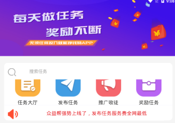 众益帮App是一个任务悬赏赚钱的平台,任务多、单价高、用户可以每天通过平台发布的任务悬赏领取按照任务步骤完成即可获得佣金奖励,还可以自已发布悬赏给别人,新注册用户首次完成三个悬赏任务即可获得一元新人奖励!首次分享App还可以获得0.2元奖励!账户余额满1元起即可获得提现资格。