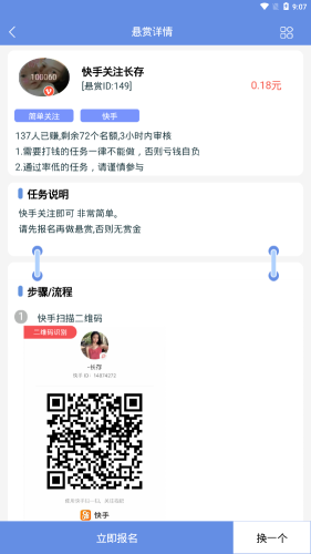 安装好应用之后选择登录即可在首页的任务大厅接取任务进行完成,任务分为高价任务跟简单任务,任务难度越大单价也就越高、平台为了用户能够积极的做悬赏任务特意每天都会有每日任务发布待用户领取后再去做悬赏时即可获得每日任务奖励了。