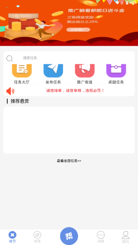 每邀请一个一级好友注册,并绑定微信就能获得0.5元,一级级有效好友(首次完成任务)就能获得1元、支持三级邀请好友,佣金奖励高达20%,悬赏任务佣金提成:一级好友5%;二级好友3%;三级好友2%。