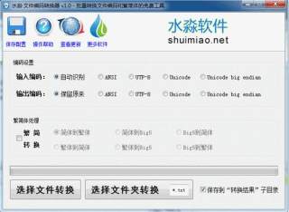 水淼文件编码转换器是一款批量转换文件的软件,软件支持编码互转(ANSI、UTF-8、Unicode、Unicode big endian)、繁简体互转(GBK繁简体、Big5繁简体)等,欢迎下载使用。