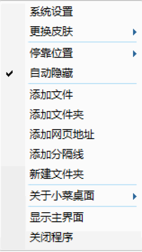 可以拖动桌面上的任意图标到小菜桌面,也可以把图标拖到小菜桌面之外进行删除,而且小菜会自定贴边隐藏,可以停靠在屏幕的上下左右四个方向,不占用桌面空间。