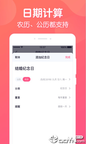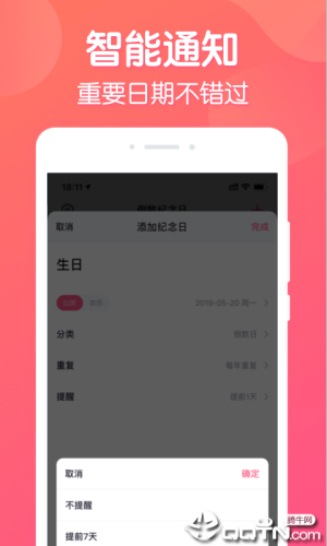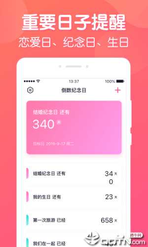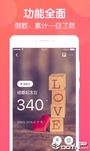 倒数纪念日记录重要日子提醒,恋爱日、纪念日、生日;功能全面,倒数、累计一目了然;日期计算,农历、公历都支持;智能通知,重要日期不错过。