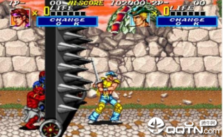 投摔:与敌人贴身后自动出现抓取状态,此时玩家按A或B键即可发动投摔。投摔过程中为无敌状态。影连与金刚在抓取敌人后按↓↑A/B会在消费一定能量后,使用出威力与溅射范围俱佳的“饭纲落”,这对于玩家在安全状态下做掉BOSS有着非常好的效果。