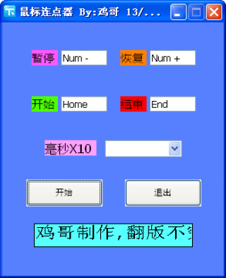 鸡哥使用脚本制作的一款很简单的鼠标连点器,具备开始、暂停、恢复、结束等基本操作,希望对你有帮助。
