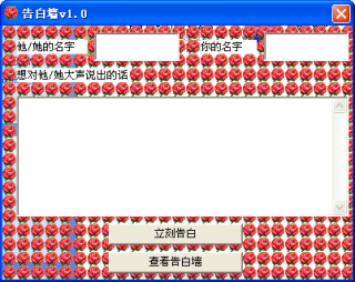 该软件是以PHP网页为主,E语言为传导接收工具的一门告白软件,操作简便,开启软件后,输入你和ta的名字,写上你想对ta大声说出的话,点击立刻告白,然后查看告白墙即可,可讲生成的告白墙当作电脑桌面哦。