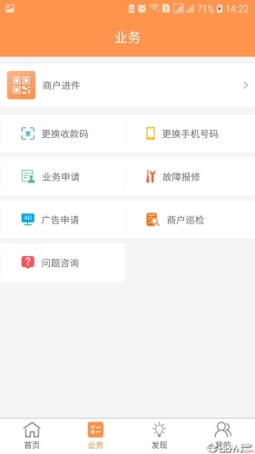 云推系统app,在业务板块,支持商户进件,可以更换收款码、更换手机号,以及提供申请业务、申请保修、申请广告等服务,帮助你在云端推广产品。