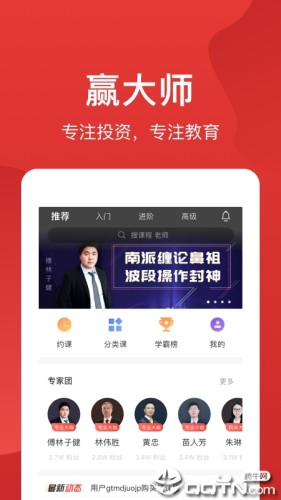 赢大师是一款专注在线学习炒股投资教育平台,由多名股市顶级大咖及近百名专业投顾团队领衔,为用户提供A股市场的投资策略参考以及投资者教育服务。由专业的投资顾问团队为用户提供炒股教学视频,解读时事要闻、分析大盘行情,剖析个股走势的盘中投顾服务;