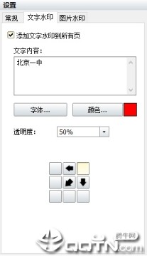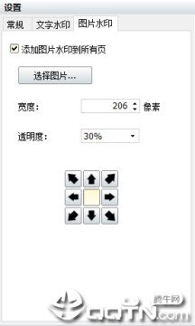 3. 支持为转换后的PDF文件中的每一页添加文字水印和图片水印。每种水印都可以设置不同的透明度,支持九种不同的摆放位置;