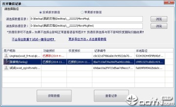 3. 打开软件,将导出的“数据目录”输入,点击“获取数据”按钮。列表中会显示出来解密成功的微信记录、授权状态和记录编号。(如果使用一键导出则会自动完成输入和获取)