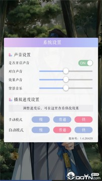 “是否开启声音”,选项,如果不小心向左滑到了“OFF”,则阅读过程中任何声音也听不到,包括男主的对白。出现这种情况时,只需对该设置再向右滑到“ON”即可。播放速度设置可以设置对白文字出现的快慢。