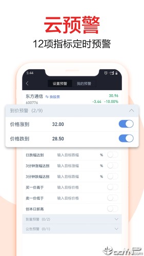 ●即时提醒-----没时间盯盘?输入股票代码,设置3项(到价、到量、公告)预警值,开启自动盯盘,个股变动,即时推送提醒消息,让你不错过任何一个投资机会;
