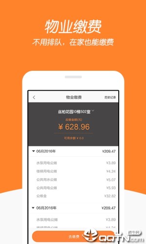 2.物业缴费:一键缴纳物业下的物业费,缴费方式有微信缴费、支付宝缴费、银行卡缴费,并可查看缴费记录;