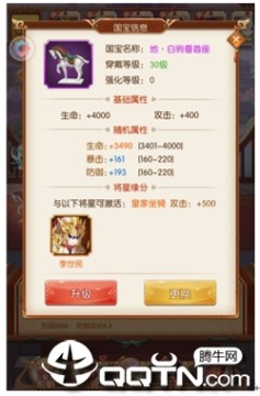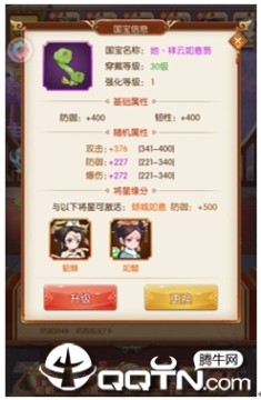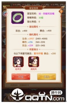 众所周知,国宝共分为四个等级,分别是:天、地、仁、和。除品级外还有与玩家武将等级相对应的初级,中级,高级三大门槛。地级国宝以上开启缘分属性,将其装备给对应武将,将获得更多的属性加成。