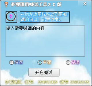 梦狸通用喊话工具是一款万能的喊话工具,可以当作游戏的喊话刷屏工具、QQ刷屏工具、YY刷屏工具等,支持所有的软件游戏,版本号是2.X,是因为目前还没发现有啥不能喊的,可能更新的频率很小,希望本工具对大家有帮助。