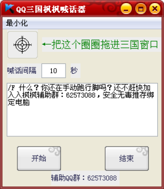 QQ三国枫枫喊话器是一款QQ三国游戏的小工具,您可以通过本软件自己设定喊话间隔,自定义喊话内容,方便快捷,自动喊话,欢迎下载使用。