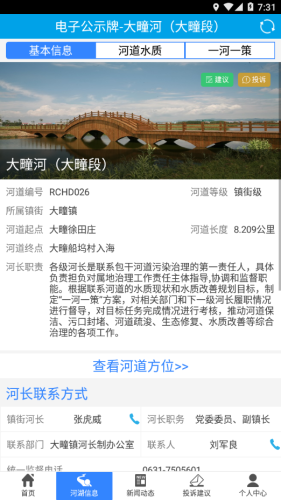 (2)河长制信息公开:以电子公示牌形式对全市范围内105条河道的“河长制”信息进行公开,公开的内容主要包括:河道基本信息,河长联系方式等。