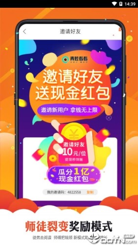 邀请好友:分享青蛙看看APP给微信好友,立得现金。亲朋好友常互动,生活多姿多彩