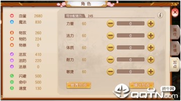二、角色加点。按角色特色把潜力点数分配给力量、法力、体质、耐力和敏捷,玩家可点击推荐加点来获得系统的加点提示,每次加点都能提升战力。