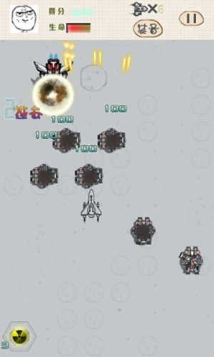 3.“核导弹”道具,点击左下角的图标启用,可以消灭全部敌机。“核导弹”用于消灭大型敌机非常实用,建议大家等待时机使用。还有更多道具,玩家可自行去发现。