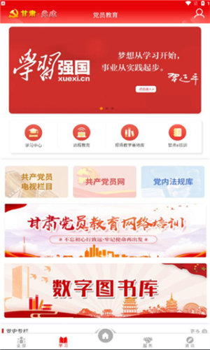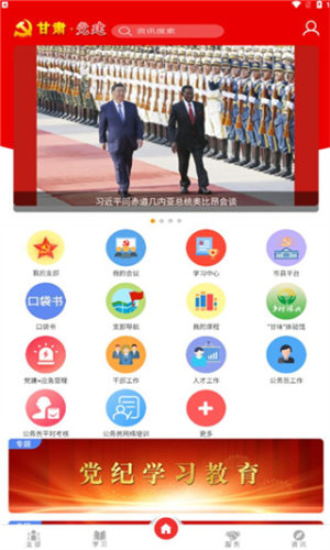 1、首先打开甘肃党建app后可以看到有我的支部、我的会议、学习中心、市县平台等功能;