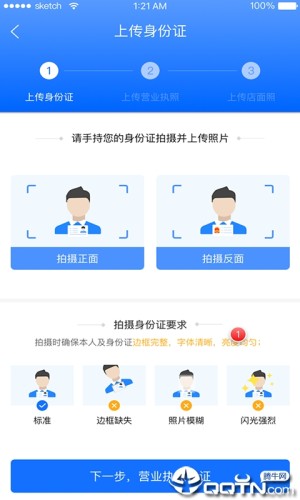 首次登陆,进行商家绑定认证,上传身份证、营业执照等信息