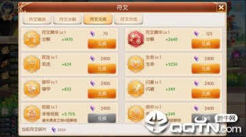 在【符文兑换】界面,可以消耗符文碎片兑换指定种类的符文,符文碎片通过每次符文寻宝获得。
