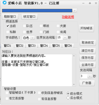 爱顺梦幻前后台喊话智能版是专用于梦幻西游2的自动喊话器工具,无需输入账号密码,直接点击登陆即可使用,智能喊话可以设置频道,字体颜色,发送间隔时间,支持前台和后台两种模式喊话,还有智能功能,智能喊话不卡屏,收到信息停喊话,有交易报警,信息报警等功能,欢迎下载体验。
