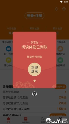 小金桔app下载,登录即可获得1元红包,在小金桔app小伙伴们既可以阅读最新最热资讯,也可以通过转发分享赚钱,收徒更有丰厚奖励哦~