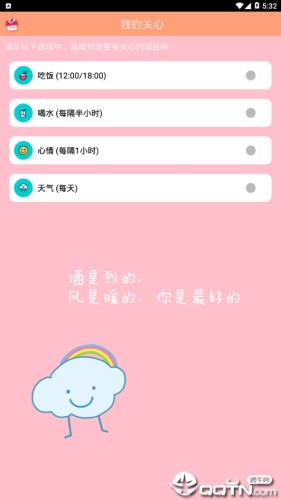 粉粉关心你是一款超级暖心的小应用,它每天提醒你喝水,吃饭,天气,活动等等,对你的生活做出提醒。让你的生活有规律,关心好自己的日常,还有超多精彩功能,快来下载体验吧。