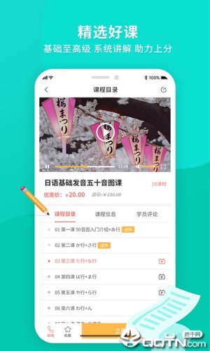日语助手app,五十音图,书写练习发音纠错基础入门;海量词书,游戏式闯关外教配音轻松背单词;每日一句,地道谚语边听边学提升口语;精选好课,基础至高级系统讲解助力上分;学习干货,考点精析备考技巧考试轻松过。