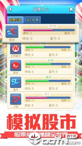 快乐有钱人是一款商战模拟经营类手游,画面精致,经典的商业题材,在叫我有钱人游戏中,最终目标就是赚到很多很多钱,模拟股市,股票能手赚翻整个世界,开发城市各地地区,自由建设美丽的梦想岛屿,更有多处公益建筑,丰富剧情内容,知名地标经典再现,你就是名副其实的有钱人。