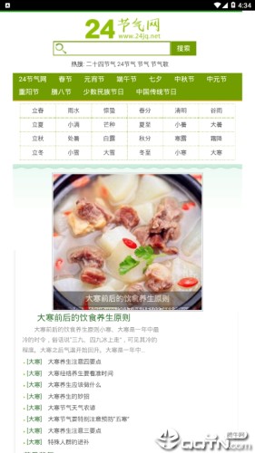 24节气网这里是专为中国传统的24 气节打造得应用。这里涵盖了242气节的介绍习俗等,非常清楚全面。界面也是非常的清爽,一目了然,查询很方便。感兴趣的小伙伴快来下载吧。
