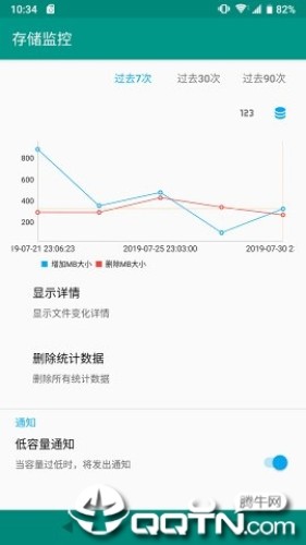 存储监控是一款超级简单的内存监控小工具,可以随时去检测你手机的内存情况,是支持通知栏的实时提醒功能的,还可以显示你最近下载应用和删除应用的次数,统计很详细的,拥有山增文件的大小显示,都是用曲线图去显示的,一目了然。