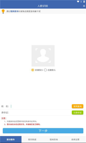 联旭健康app是一款人脸识别应用,软件是拥有面访服务,暂存数据,联网查询等等诸多功能,软件不仅方便了广大用户,还提高了基本公共卫生服务的效率。