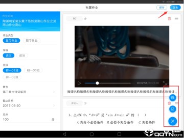 老师登录后选择作业模块,点击布置作业,选择作业类型,作业的学科、班级等基本信息,在再作业中添加习题,同时支持作业中插入视频,完成编辑后,点击发布即可。