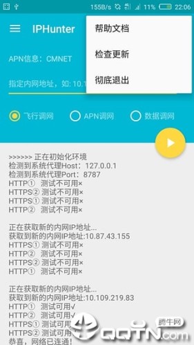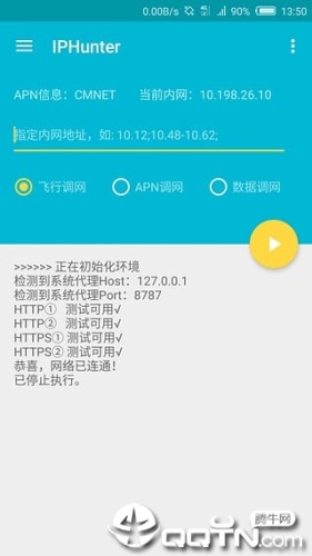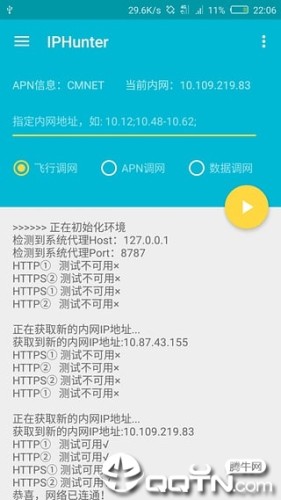 IPHunter是一款安卓手机上的查IP工具,功能十分强大,支持自动调内网ip、指定网段、指定调网方式、飞行模式、APN模式。数据开关模式等,欢迎下载使用。