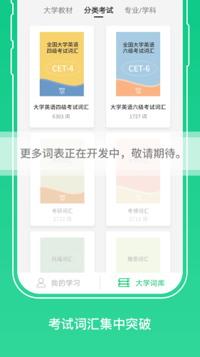 考试词汇模块目前收录全国大学英语四级考试词汇和六级考试词汇,内容包括完整词表、发音、释义(英汉双解)、典型例句(英汉对照)等,旨在帮助用户考前有针对性地学习或集中复习词汇,以期助力通过相关考试。