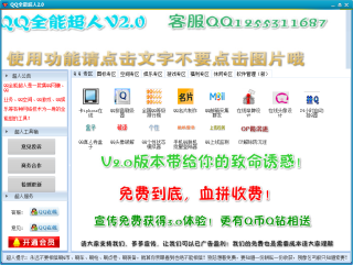 QQ全能超人是一款集QQ网赚、QQ业务、QQ空间、QQ游戏、QQ娱乐等各种网络技术为一身的全能型工具,完全免费,开启软件后,要使用功能请点击文字不要点击图片哦,v2.0版本已发布,新增软件管理功能,将带给你致命的诱惑,另外宣传本软件还可获得3.0的体验资格,更有Q币Q钻相送。