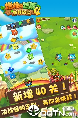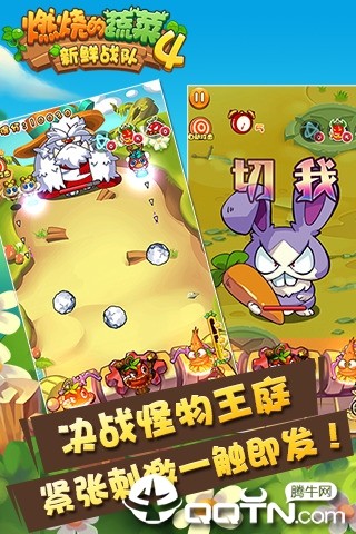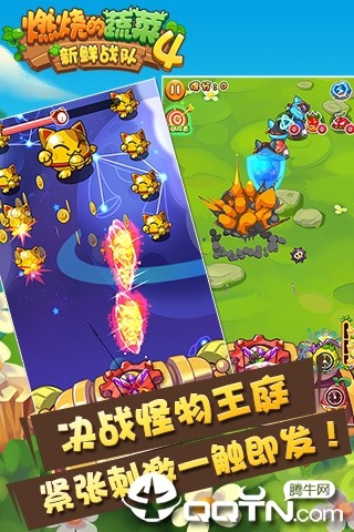 燃烧的蔬菜4新鲜战队是燃烧的蔬菜系列,也是一款休闲益智类手游。玩家需要设定固定的战斗装备以及练习弹射技巧,抵御敌人和入侵,保卫它们的蔬菜水果家园。