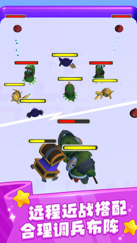 超级简单的合成类作战小游戏。只需拖动相同的动物进行融合,就能获得高级怪兽,战斗力大大提升。合理的远近攻击搭配与排列,能发挥出最佳的战斗效果。快来合成属于你的战力天兽吧!