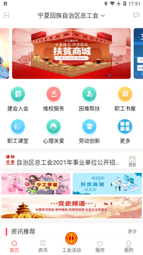 宁工惠app是宁夏总工会官方制作推出,软件拥有建会入会,困难帮扶,普惠城,维权站,就业所,劳动保护等功能服务,可以帮助工会会员更好的办事生活。