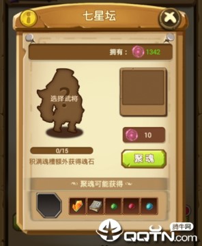 七星坛可以通过挑战关卡成功后获得的武魂聚魂,聚魂可选择武将来获取相对应的武将碎片以及游戏道具等
