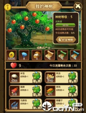 玩家可通过挑战关卡以及各游戏里的渠道收益的粮食进行灌溉,每种粮食对神树的成熟度不一样,神树每天可成熟五次,