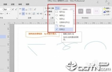 打开Visio文件,我们在功能区域的最上方会看到很多的功能,在如图标注位置,是手工画图区域,这块区域的功能基本上都可以手工操作。