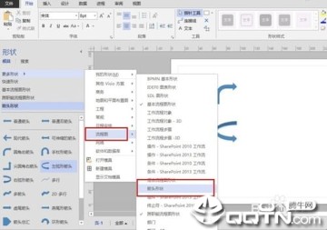 还有一种方法是在Visio中有模版提供箭头图, 具体位置见图示, 直接选中需要的箭头拖动到绘图区域即可.
