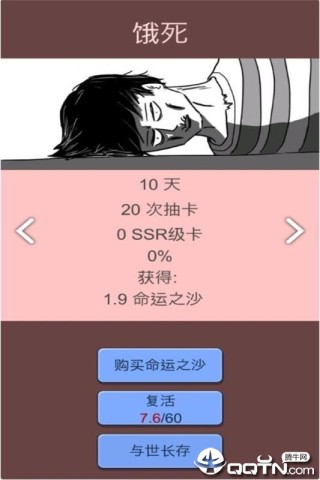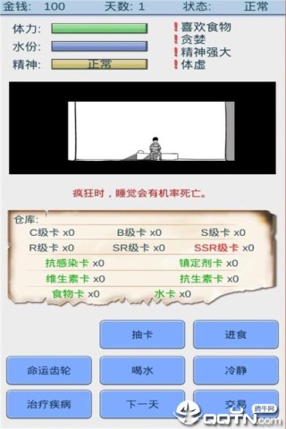 这是一款卡牌玩法的生存类手游。这款游戏非常有意思,在游戏中玩家会通过抽卡的方式生存下来,无论是生活用品还是食物都必须通过抽卡的方式来获得,而且你还能够找到稀奇古怪的独特卡牌。